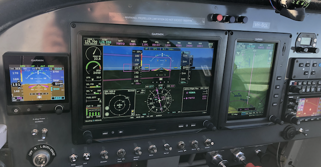 The aircraft is equipped with a Garmin GNS430W aviation-grade GPS navigation system accurate to about 1.5m, a pair of Garmin G3X Touch glass-cockpit displays, a backup Garmin G5 digital flight instrument with its own independent backup power systems, two VHF radios for comms with ATC and other airplanes, and a Garmin GMC 305 autopilot. The main instruments are networked together, so the GPS system can instruct the autopilot to fly the aircraft around a predetermined flight path and display its status on the digital displays. It has enough equipment and backup systems to legally fly at night or in "instrument conditions" in cloud or fog.